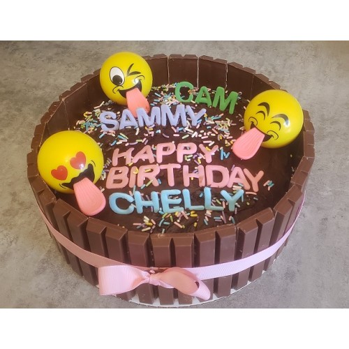 Inside, you’ll find soft, moist cake layers filled with creamy frosting — all surrounded by a Kit Kat border for that extra chocolate crunch. Each cake can feature your favorite emojis, from laughing faces to heart eyes, making it totally customizable for birthdays, parties, or just because!